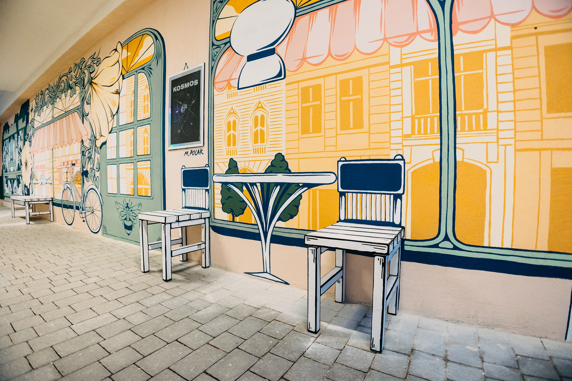 The wall leading from Kilińskiego Street to the courtyard has been adorned with a mural created by Maciek Polak. Benches and tables are incorporated into the artwork, encouraging neighbourly gatherings. There is also a bookcrossing shelf for the estate’s book exchange.