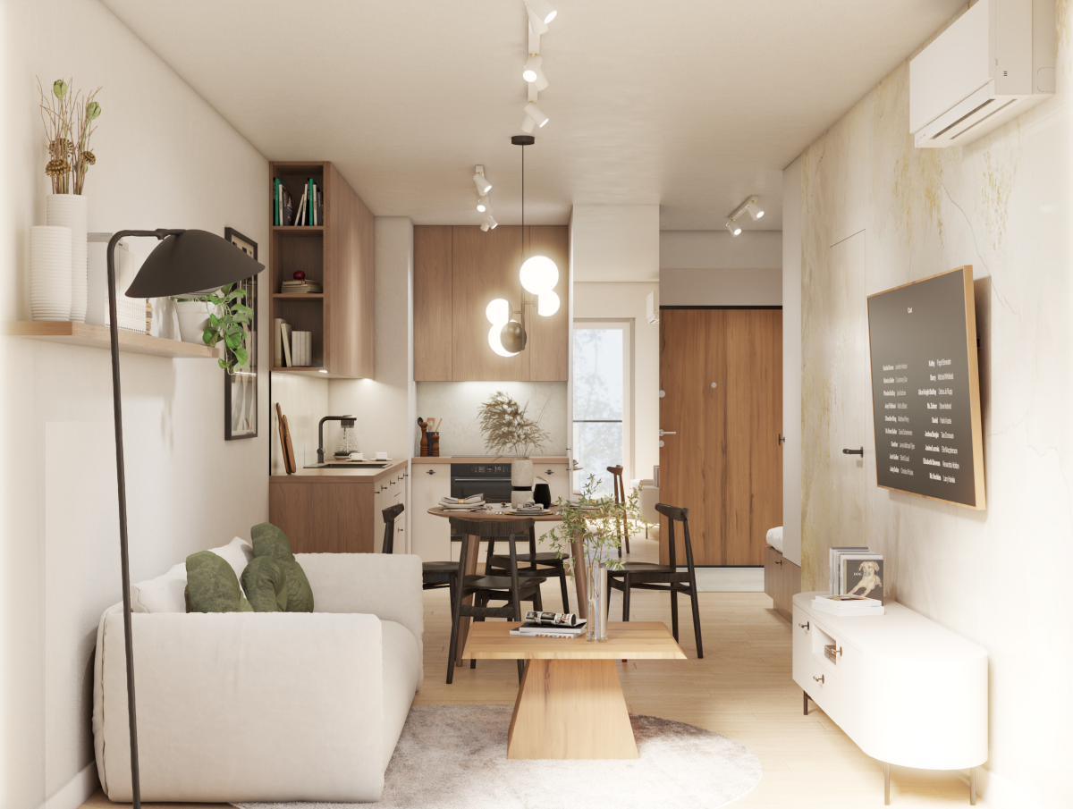 Квартира розташована на 3 поверсі з вікнами західної експозиції у напрямку вулиці Кілінського. Складається з передпокою, зручної вітальні з кухонною зоною, спальні та ванної кімнати. До квартири належить балкон.
